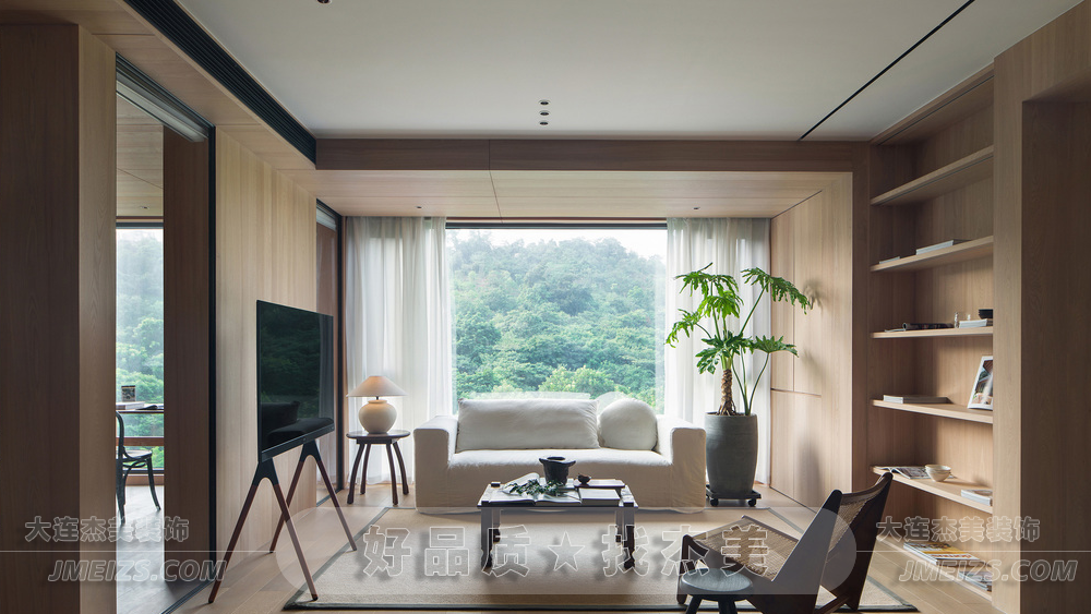 在色彩搭配上,設計師主要使用了原木的自然色和白色,這兩種色彩的結合既簡潔又大氣,給人一種清新自然的感覺。同時,通過在某些地方添加一些亮色,如綠色的植物、彩色的抱枕等,使得整個空間更加生機和活力。
