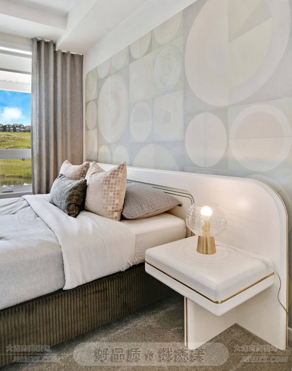 臥室的一側是一扇大面積的窗戶,它引入了大量的自然光,讓整個空間明亮而通透。窗外的綠色植物映入眼簾,讓人感受到大自然的呼吸和生機。