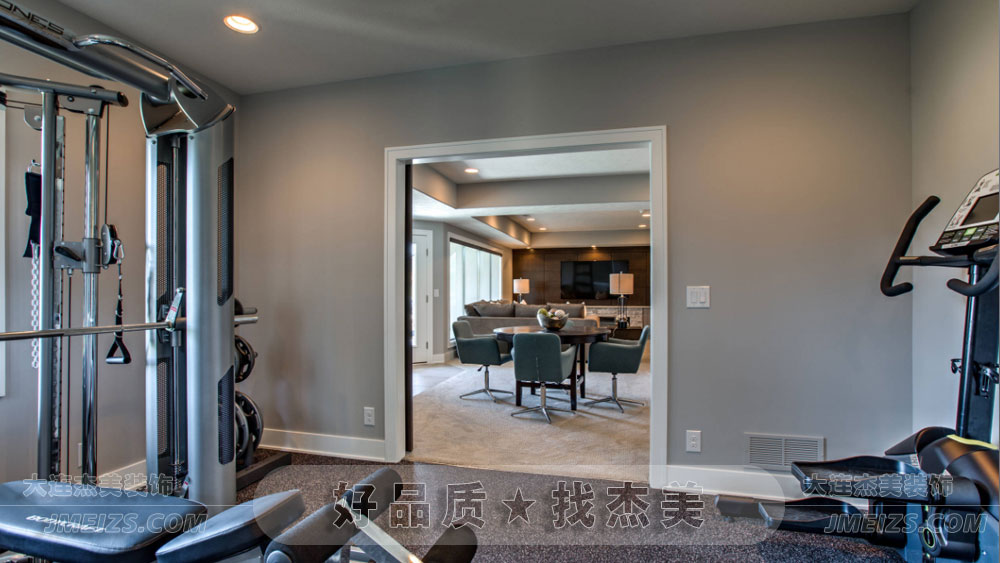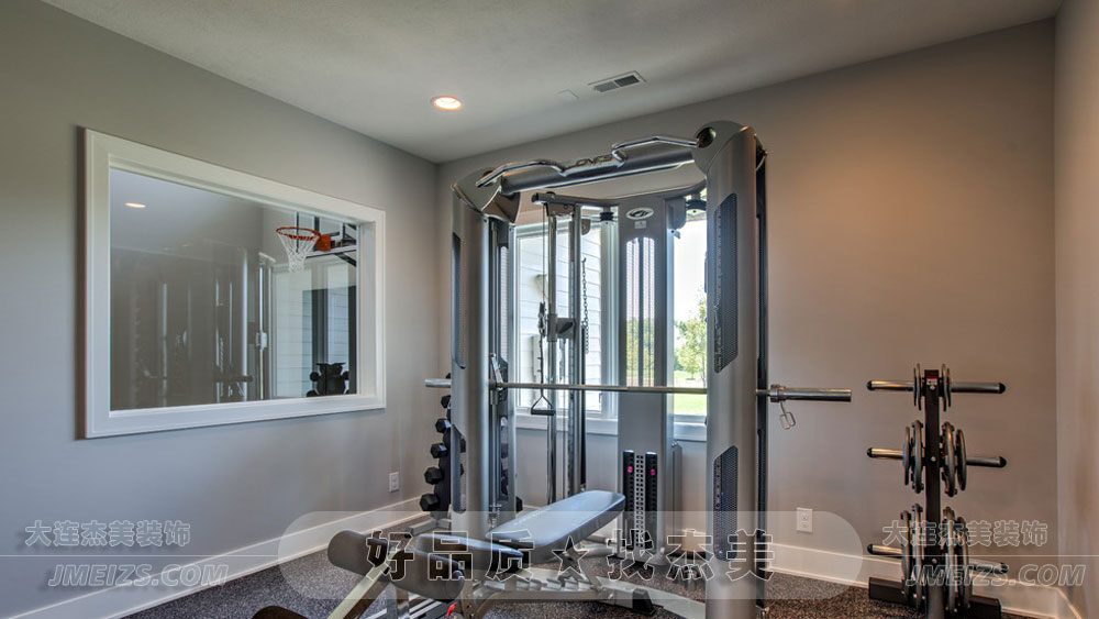 健身房間頂部安裝了一排簡約而時尚的白色射燈,提供了充足而均勻的照明效果。健身房間的設計是一個充滿了現代和簡約的空間,它既能滿足主人的鍛煉需求和功能,又能體現主人的健康意識和自律精神。