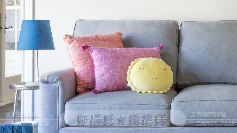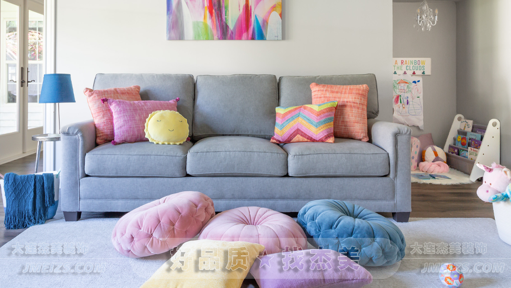 抱枕和毛絨玩具灑落在親膚的沙發(fā)上,