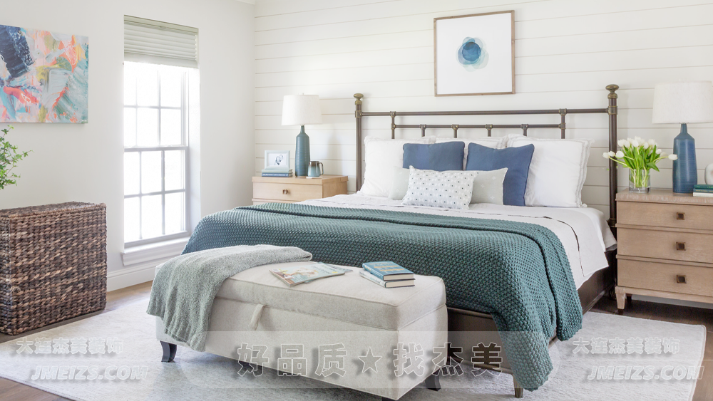 這個臥室以其色彩、布局和紋理的精心選擇,